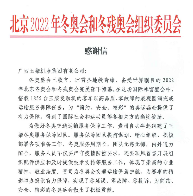 查看詳情3月28日,玉柴收到一封來自北京冬奧組委的感謝信。這封官方的感謝信為玉柴作為主力軍,以高品質(zhì)、零故障的表現(xiàn)圓滿完成北京冬奧會的運輸服務(wù)保障任務(wù)給予高度肯定。